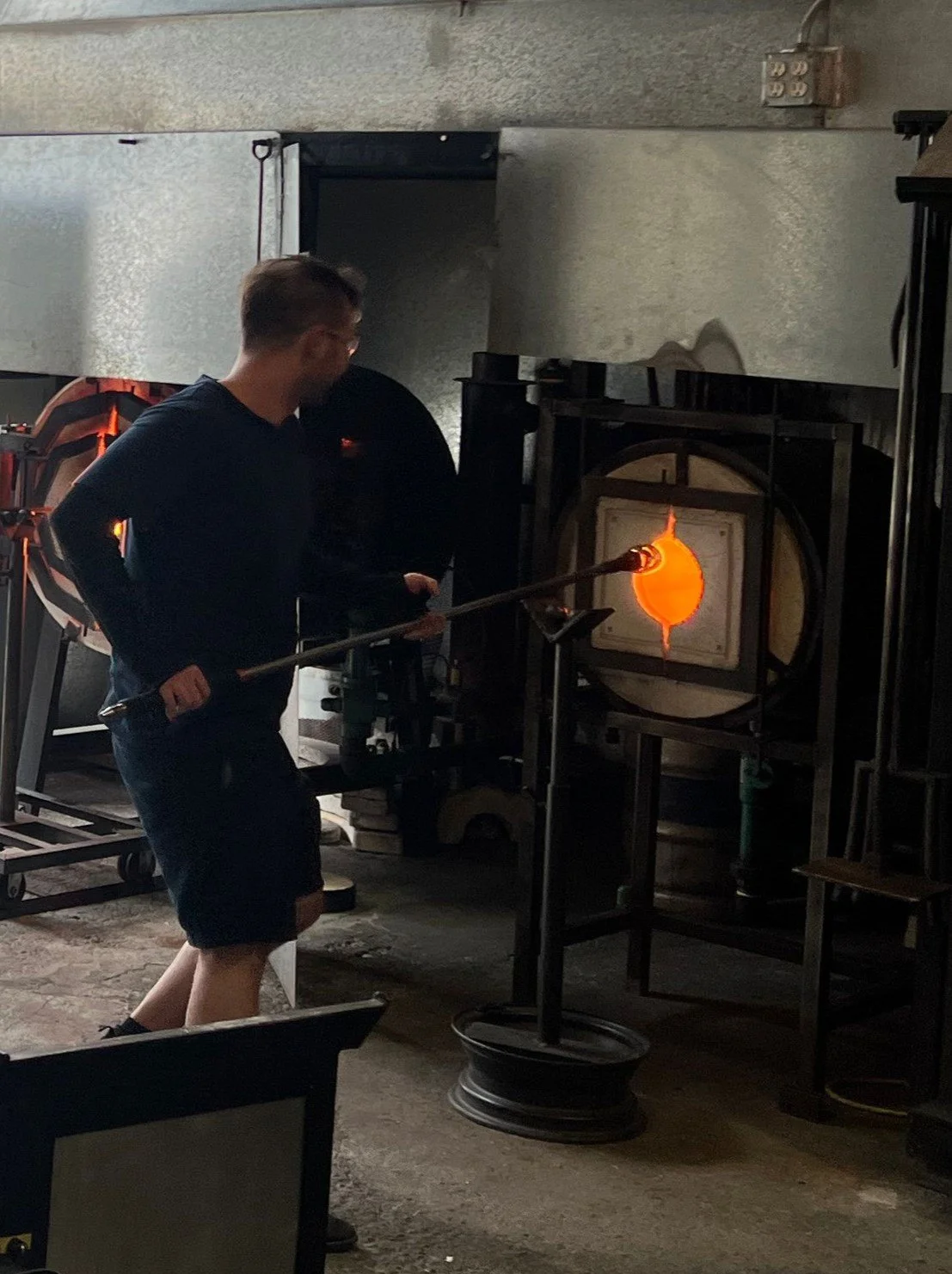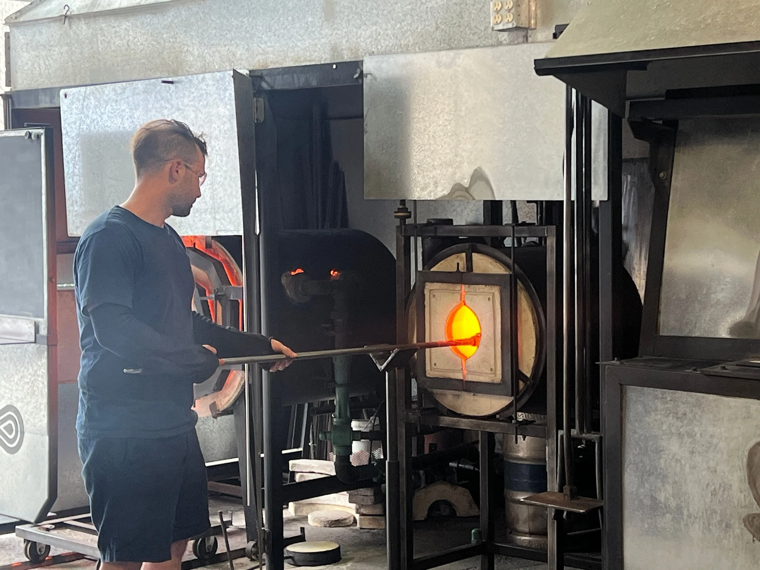 The glass-blowing process requires many hours to master. Picking, handling, shaping and blowing is a multi step process which requires patience and a keen eye to understand when the best point to form the shape is. My attempt at the vase took multiple tries to get something large enough for this type of object, and during the blowing process the glass took the shape of a large lightbulb before partially deflating and creating an odd shape. With limited time to work with this was my best representative piece, and so I went with it as my final outcome.