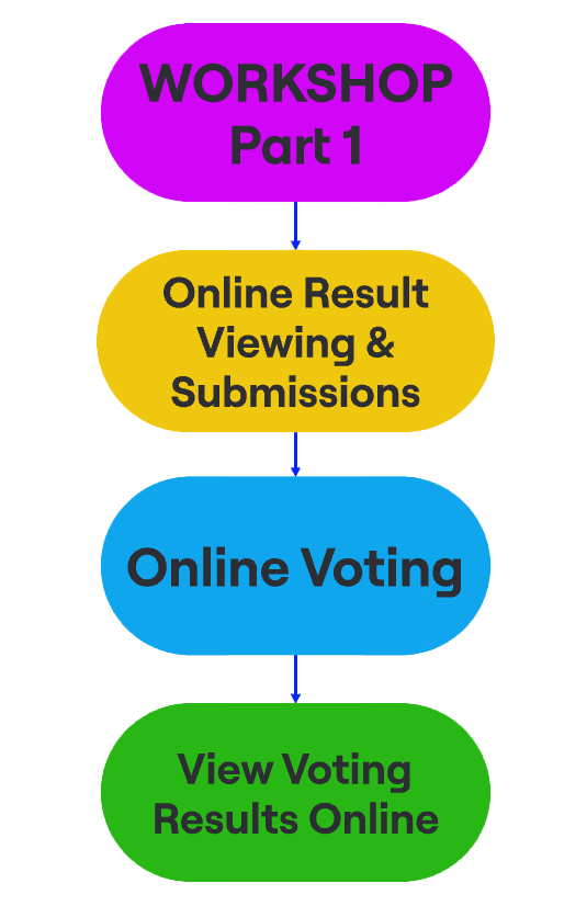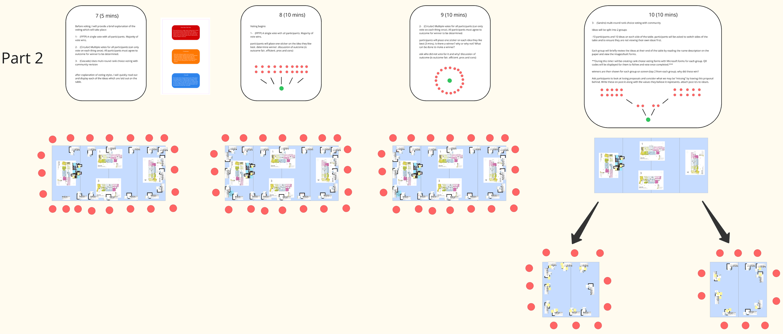 A workshop allowing for discussion, idea sharing and image and model building was created as a part of the voting process to increase community involvement. This method also allowed for my voting system to be tested against other methods to determine its effectiveness for large-scale decision making. The flow path of the workshop was developed through several iterations using Miro.