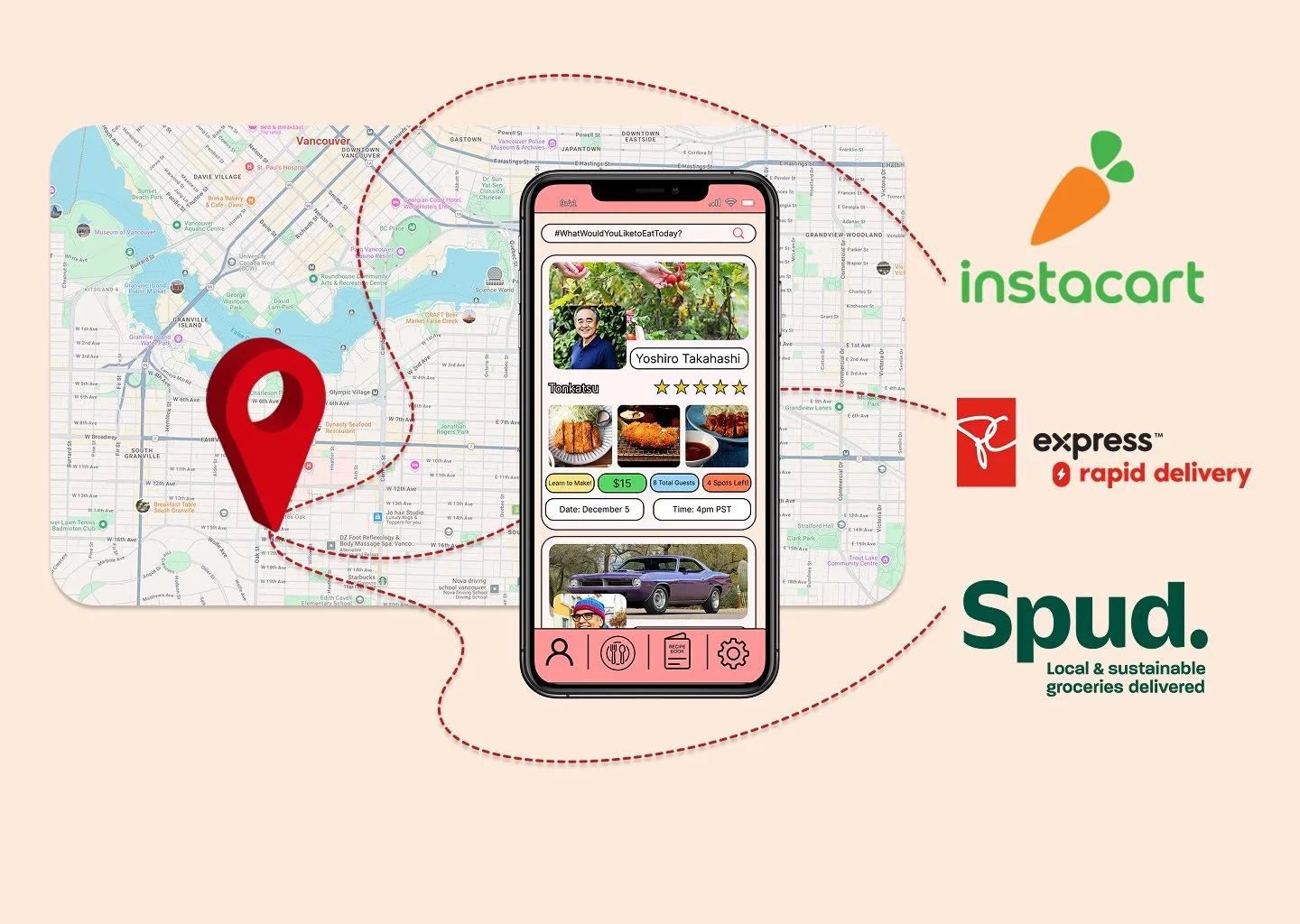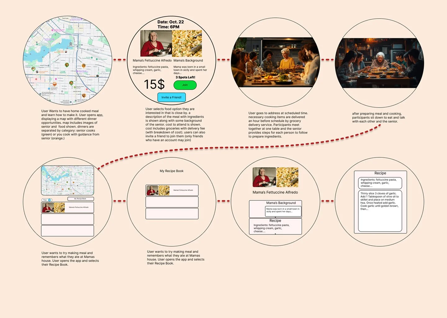 Seniors list their favorite meal on the app, along with personal interests to connect over with young adults. They then have an opportunity to guide young adults through the steps of making the meal while getting to know each other. A step-by-step process makes creating and joining meals simple for both parties.